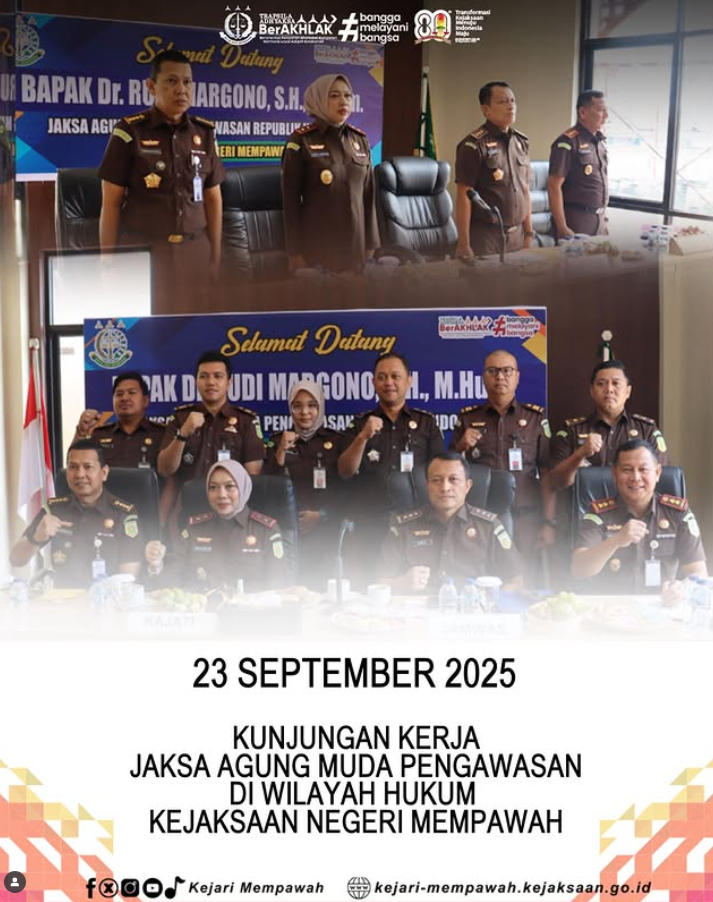 Jaksa Agung Muda Pengawasan Kejaksaan Agung RI, Dr. Rudi Margono, SH., M.Hum, bersama rombongan melakukan kunjungan kerja ke Kejaksaan Negeri Mempawah . Kehadiran beliau disambut oleh Kepala Kejaksaan Negeri Mempawah Bapak Lufti Akbar, SH., MH beserta seluruh Pegawai Kejaksaan Negeri Mempawah