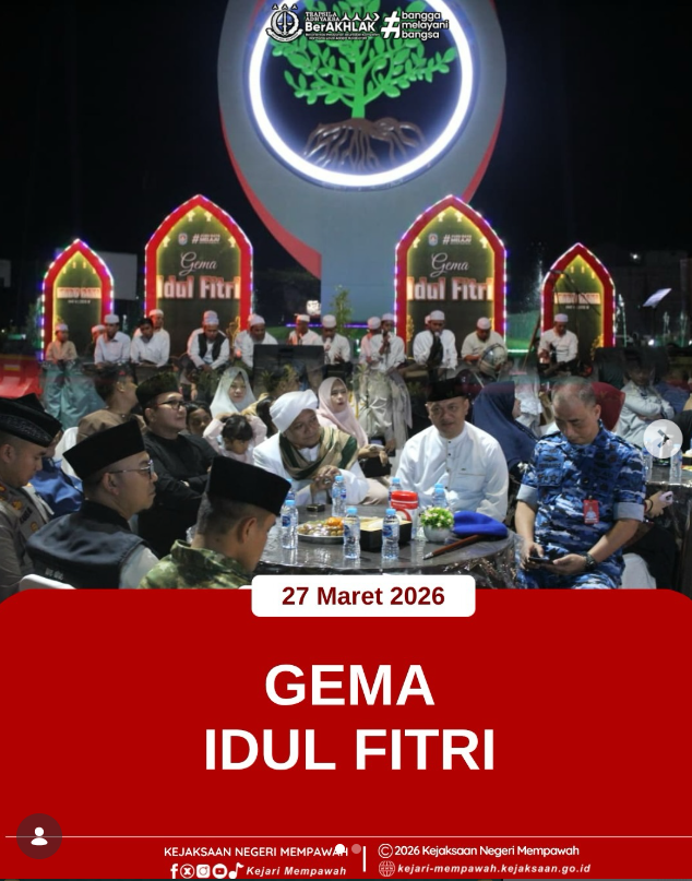Pada hari Jumat, 27 Maret 2026, Kepala Kejaksaan Negeri Mempawah, Bapak Dr. Samsuri, S.H., M.H., menghadiri kegiatan Gema Idulfitri yang diselenggarakan oleh Pemerintah Kabupaten Kubu Raya di Bundaran Gaforaya. Kegiatan tersebut turut dihadiri oleh Bupati Kubu Raya, H. Sujiwo, S.E., M.Sos., Wakil Bupati Kubu Raya, H. Sukiryanto, S.Ag., Komandan Kodim 1207/Pontianak, Letkol Inf. Robbi Firdaus, serta para pejabat daerah dan unsur Forkopimda lainnya.